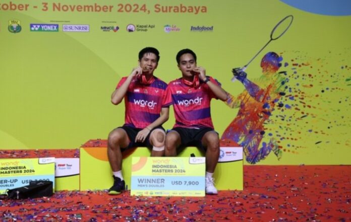 Dalam laga yang berlangsung di Jatim Expo, Surabaya, Minggu (3/11/2024) ganda putra ranking 51 dunia itu naik podium tertinggi seusai mengalahkan rekan satu negaranya, Raymond Indra/Patra Harapan Rindorindo.