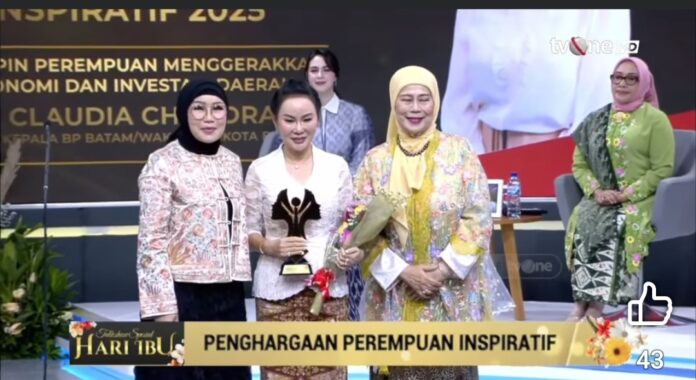 JAKARTA, Desaintoday.com – Wakil Wali Kota Batam sekaligus Wakil Kepala BP Batam, Li Claudia Chandra, menerima penghargaan Perempuan Inspiratif: Pemimpin Perempuan Penggerak Ekonomi dan Investasi Daerah dalam Talkshow Spesial Hari Ibu TV One di Jakarta, Senin (22/12/2025).